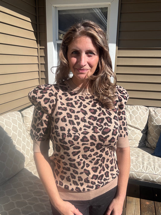 Brown Leopard Pattern Lace Trim Ribbed Detail Button Cuffed Sweater