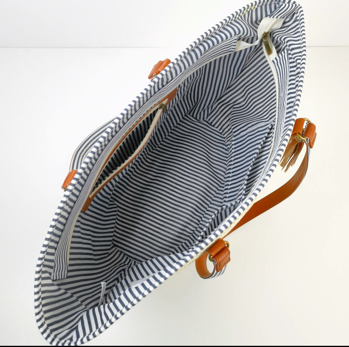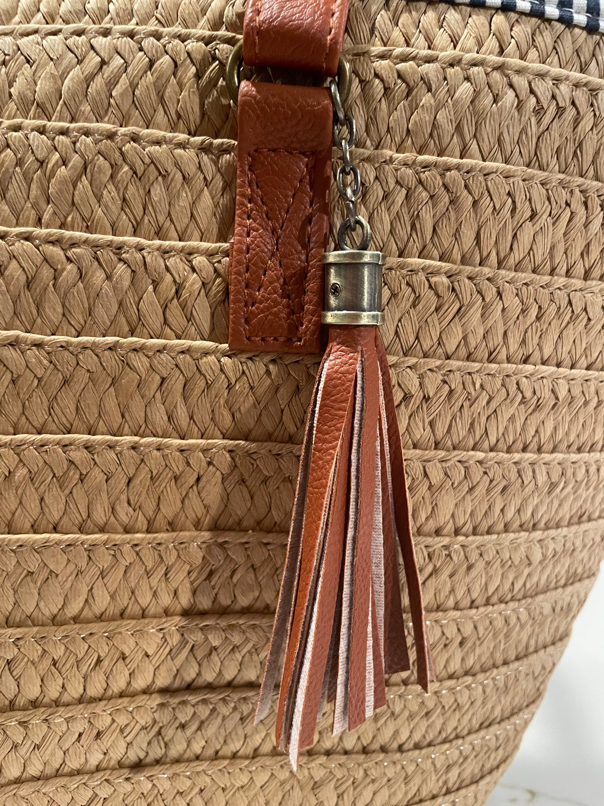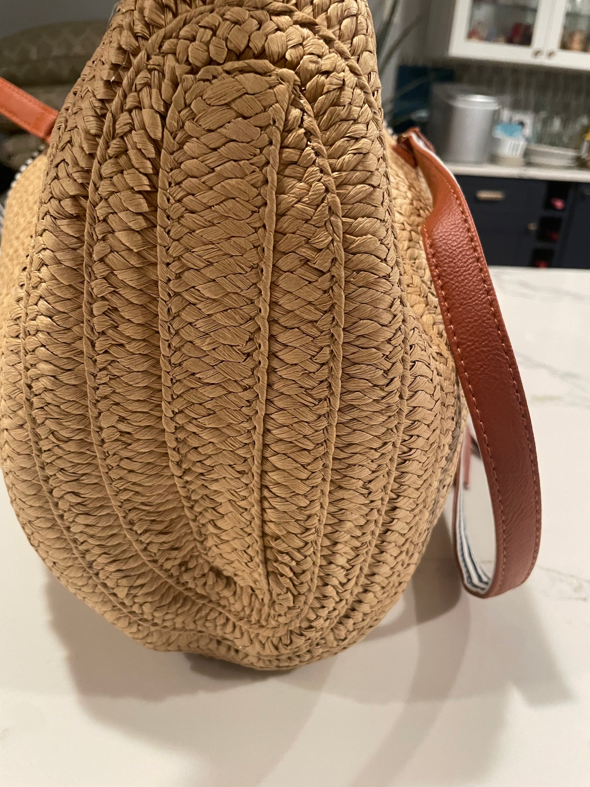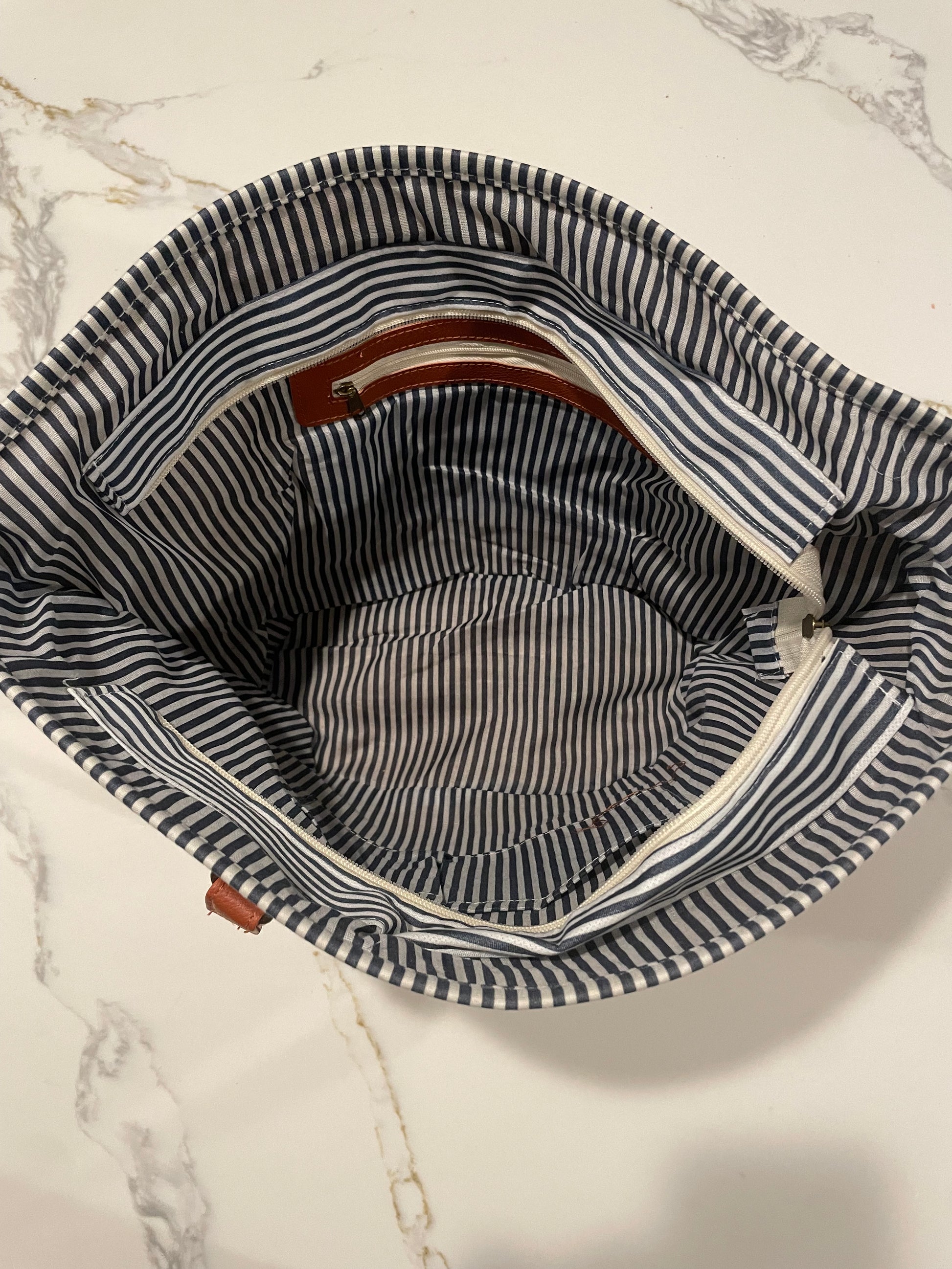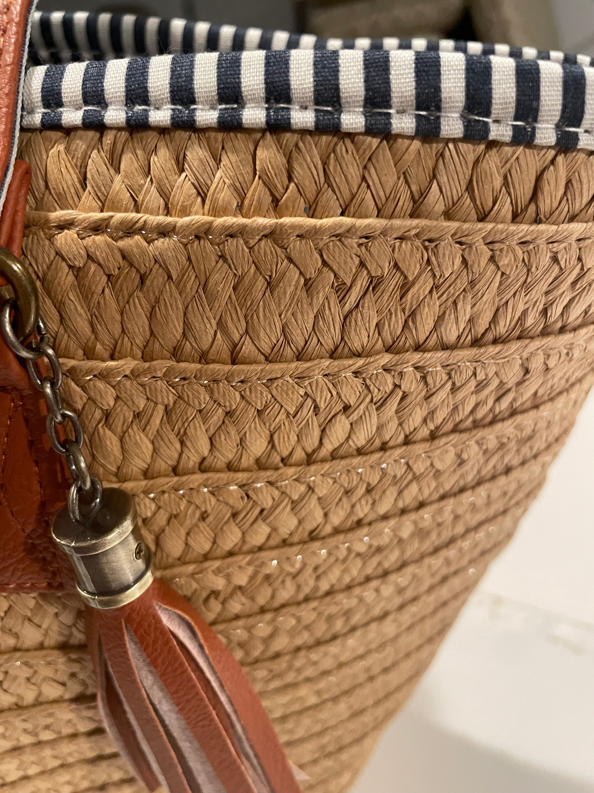 Hand-woven straw bag with blue and white stripe lining. Interior pocket and zipper area for extra storage. Bag zips closed for extra protection