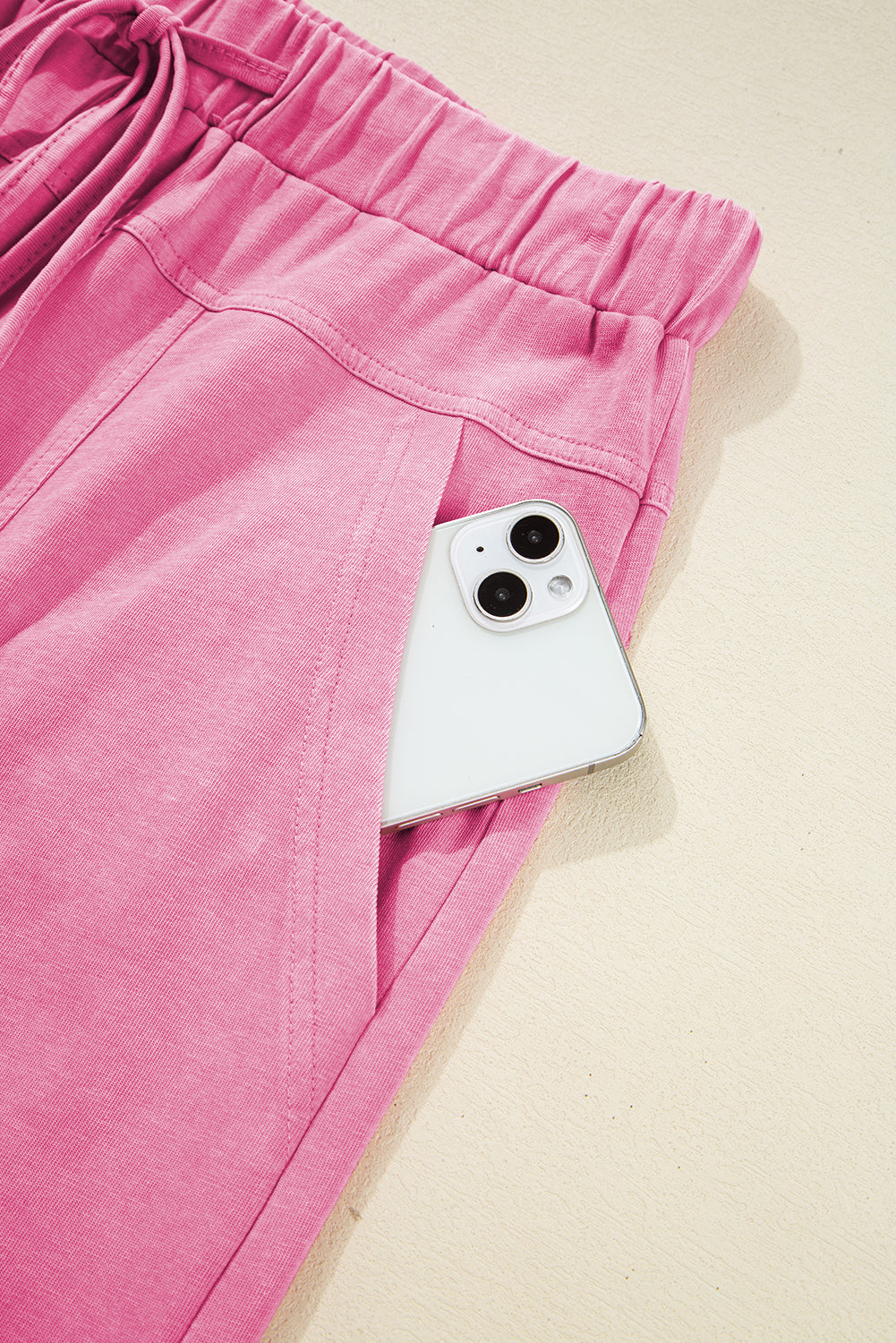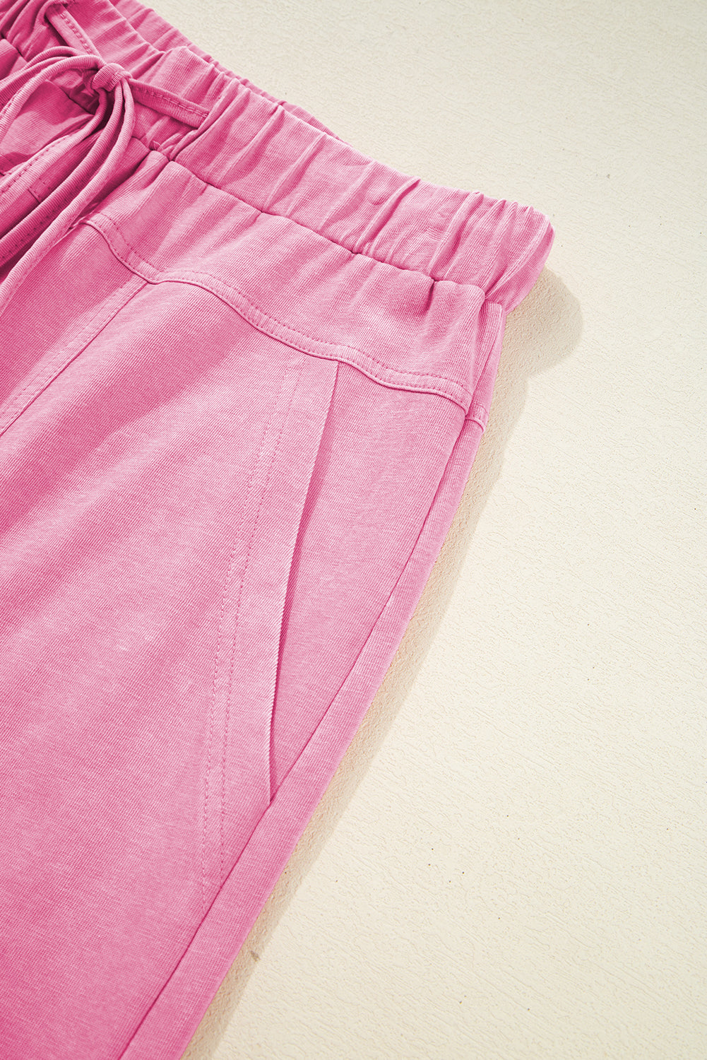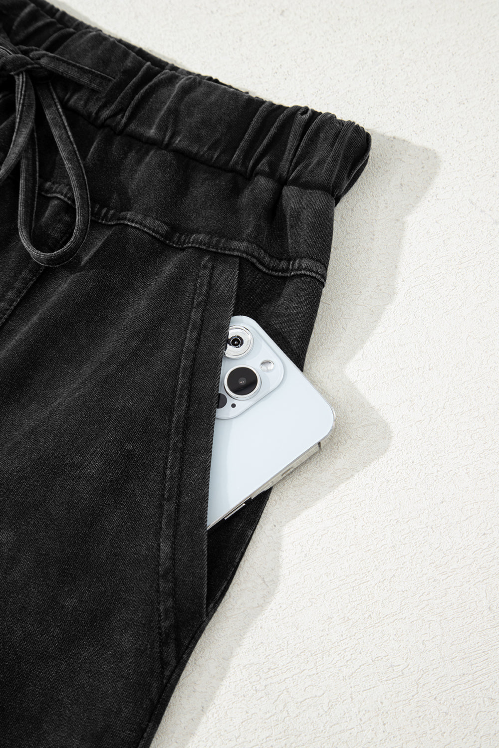 These cotton wide leg pants have a stylish classic mineral wash hue with an exposed seam and adjustable drawstring waist for a customizable fit.