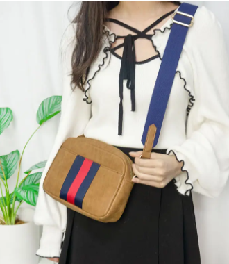 Vegan Leather crossbody with blue and red stripe. Don't let size fool you, this zippered crossbody has an outside pocket plus an inside zippered pocket.