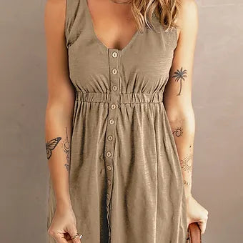 Tank dress with elastic waistband. This lightweight material is perfect for summer! Pair with your favorite sandals and a handbag for an effortless look.