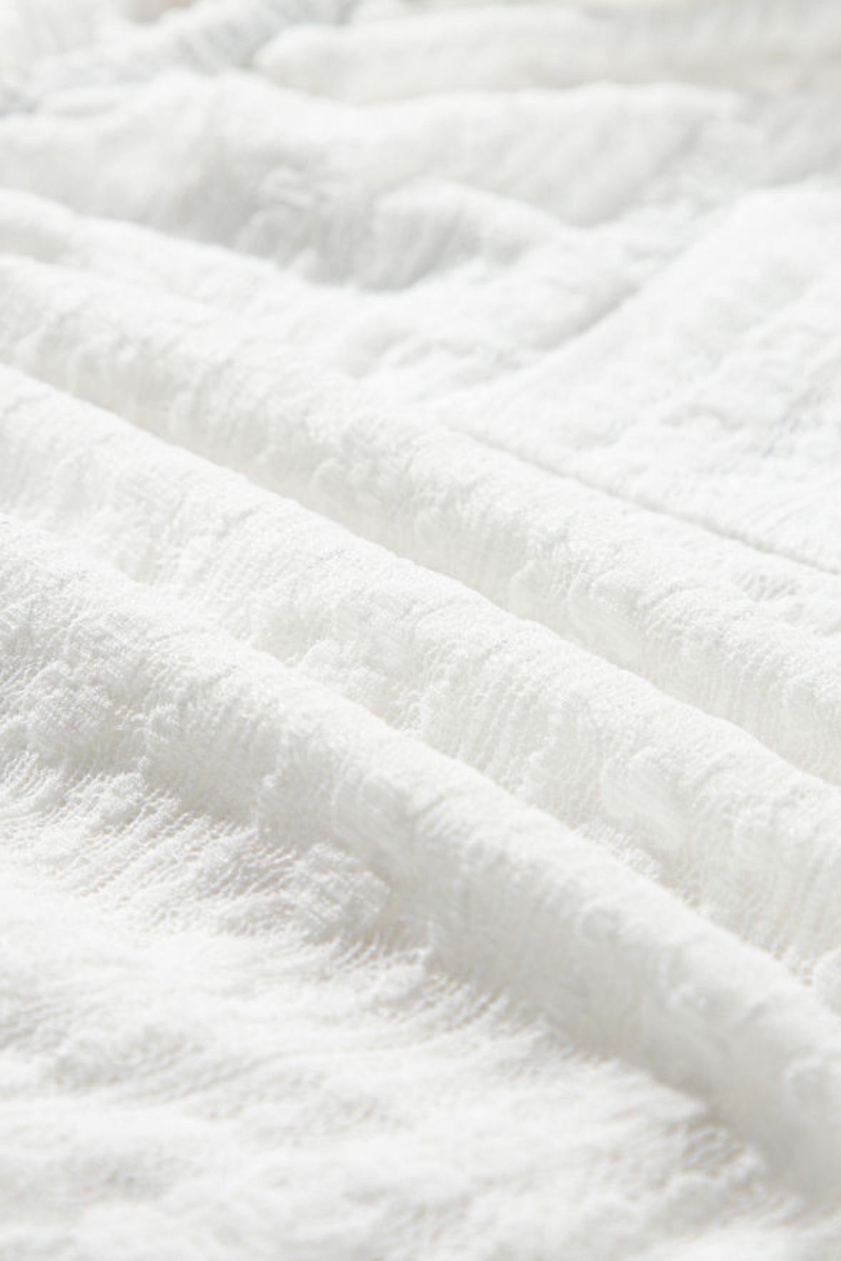 White lace romper with spaghetti straps, elastic waist, and pocket pockets.